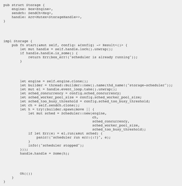 接下来在Storage中实现了async_get 和async_batch_get等异步函数,这些函数中将对应的指令送到通道中,然后被调度器(scheduler)接收到并异步执行。