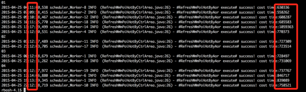 通过日志观察,执行时间 由50多分钟缩短到15分钟以内 ,下图是截取了一天的4台机器的日志时间(单位: 毫秒 ):