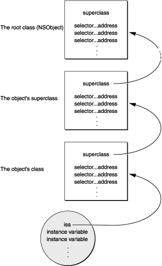 setOrigin:: 的 selector,你可以找到这个方法实现的地址(address of the procedure that implements setOrigin:: )。 在一个对象被创建出来的时候,它会被分配一块内存,而且它的成员变量也会进行相应的初始化。在它这些变量当中,排头的就是一个指向它类结构(class structure)的指针。这个指针叫做 isa ,通过 isa ,对象可以访问它自己的类,而通过它自己的类,它还可以访问到它继承下来的所有父类。