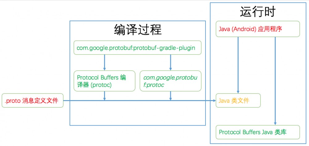 在使用 Protocol Buffers 时,我们需要以特殊的方式定义我们的结构化数据,保存为 .proto 消息定义文件。 Protocol Buffers 项目为我们提供了编译器,可以将 .proto 文件编译为Java文件以用于我们的Java 或 Android应用项目。这个编译器在我们的PC机上编译并运行。产生的Java文件是依赖于 Protocol Buffers 的Java库的,比如这些文件实现了库的借口等。我们将生成的这些Java文件和 Protocol Buffers 的Java库引入我们的Android应用项目,就可以方便地以 Protocol Buffers 的二进制格式操作结构化数据了。