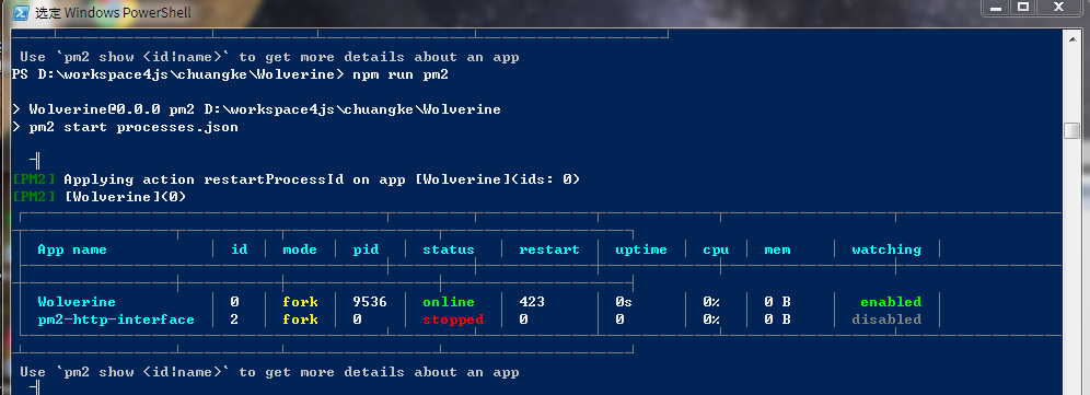 $ pm2 show Wolverine 或者 $ pm2 show 0