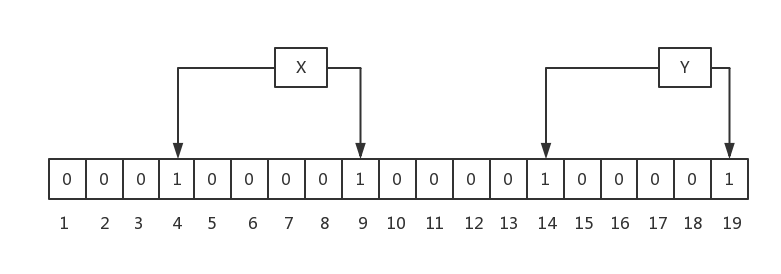 如上图,插入了两个元素,X和Y,X的两次hash取模后的值分别为4,9,因此,4和9位被置成1;Y的两次hash取模后的值分别为14和19,因此,14和19位被置成1。