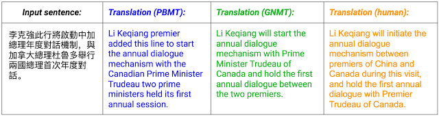再进一步,翻译有一个很重要部分是「语序调整」。比如中文会把所有的定语都放在中心词前面,英文则会把修饰中心词的介词短语放在后面,机器常混淆这个顺序。NMT 在语序学习上的优势也带来了它翻译的流畅性。