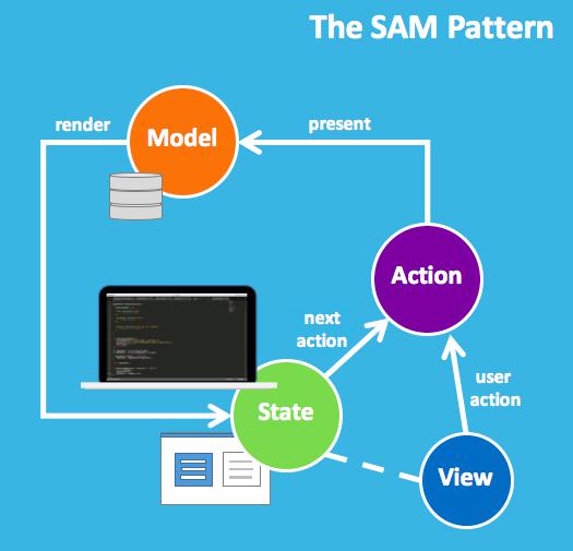 SAM建议将图形用户界面底层的业务逻辑分为三个概念:操作(Action)、模型(Model)和状态(State)。操作向模型供值,仅模型可以接受这样的值。一旦接受,将通过状态验证所有订阅方,尤其是视图(视图可看作“状态的具体呈现”)已经获得通知。每个事件可作为“步骤”进行处理,步骤可由提议/接受/学习流所组成。这种概念为事件排序和效果(如后端API调用)的处理提供了一个坚实的基础。