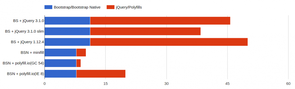 所以使用 Bootstrap 组件时,大小范围在 [38.4, 50.0] KB,而使用 Bootstrap Native,这个范围缩小到 [8.9, 19.9] KB.