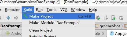 然后这时候点击build中的make project 就可以自动生成相应的文件了:DaoMaster,DaoSession,NoteDao。