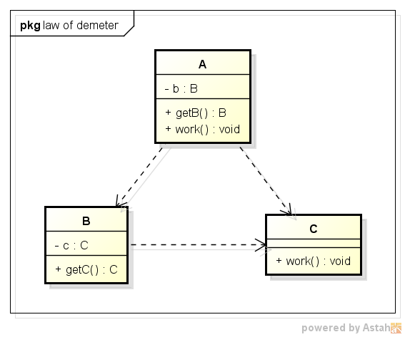 上面代码只是修改了下类A和B的work方法,使之符合了迪米特法则: