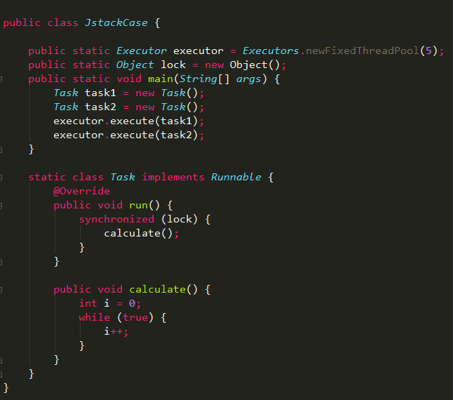 在top命令中,已经获取到了占用cpu资源较高的线程pid,将该pid转成16进制的值,在thread dump中每个线程都有一个nid,找到对应的nid即可;隔段时间再执行一次stack命令获取thread dump,区分两份dump是否有差别,在nid=0x246c的线程调用栈中,发现该线程一直在执行JstackCase类第33行的calculate方法,得到这个信息,就可以检查对应的代码是否有问题。
