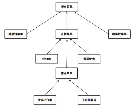我们平时去餐厅吃饭,都会使用菜单来点餐,今天我们来实现一个超级菜单,这个一个菜单大集合,包括单一菜品和子菜单,如图所示: