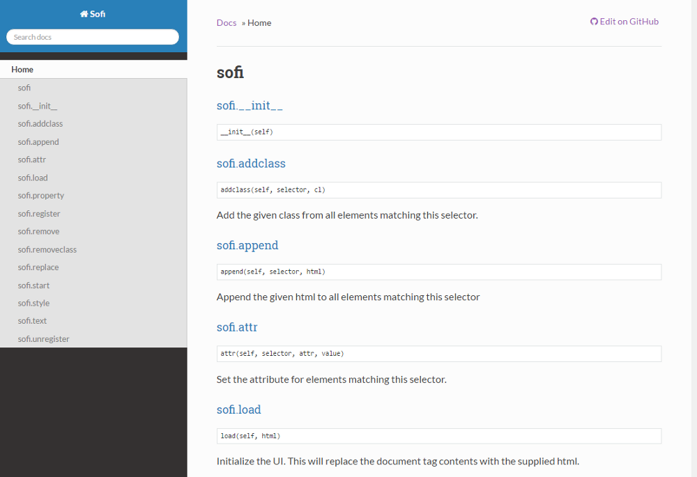 # sofi<a name="sofi"></a><a name="sofi.__init__"></a>### [sofi](#sofi)./_/_init/_/_ ```python __init__(self) ``` <a name="sofi.addclass"></a> ### [sofi](#sofi).addclass```python addclass(self, selector, cl)``` Add the given class from all elements matching this selector.