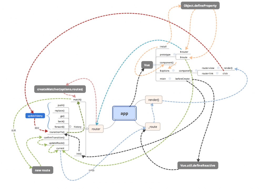 继续回到 beforeCreate 钩子函数中,在最后通过 Vue 的工具方法给当前应用实例定义了一个响应式的 _route 属性,值就是获取的 this._router.history.current ,也就是当前 history 实例的当前活动路由对象。给应用实例定义了这么一个响应式的属性值也就意味着如果该属性值发生了变化,就会触发更新机制,继而调用应用实例的 render 重新渲染。还记得上一段结尾留下的疑问,也就是 history 每次更新成功后都会去更新应用实例的 _route 的值,也就意味着一旦 history 发生改变就会触发更新机制调用应用实例的 render 方法进行重新渲染。