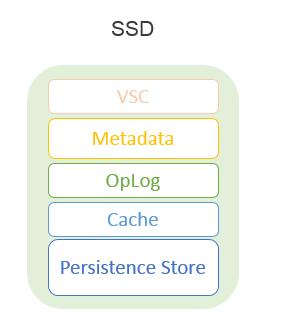 SSD存储了一些关键的组件,包括:LHS Home(VSC虚拟存储控制器核心)、Metadata(元数据)、OpLog(写缓存)、Cache(缓存)和Persistence Store(持久存储)。下图展示了SSD的存储分解: