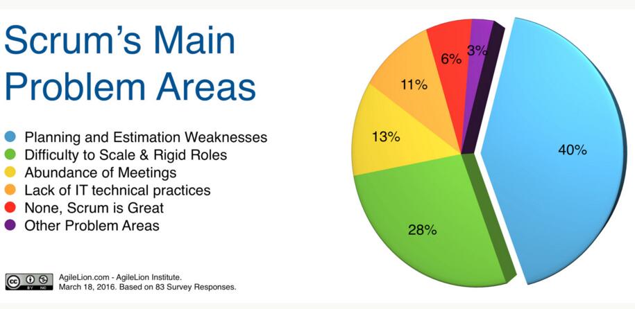 然而,Scrum并非没有缺点,也不是没有可提高的空间。最近通过Agilelion研究所,我们用调查的形式收集了一些关于这个话题的反馈意见。原创文章中有我们研究结果的详细报告,但我还是想用下面的图表总结我们的研究结果: