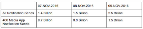 在选举日的24个小时中,Urban Airship共推送了25亿条通知消息,这是它有史以来的单日最高推送量了。这大概相当于为每个美国人推送8条通知消息,或者为这世界上每一个在网的手机号码都推送一条消息。由于Urban Airship在各个行业里共支持了约4.5万个手机应用,对选举日数据的分析表明有400多个媒体应用发送了这个消息量的60%,即在跟进选举过程和报告结果的过程中,一天就发送了15亿条通知消息。