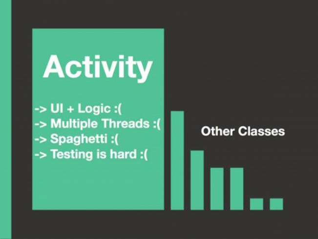 然而,在Android开发中,如果你不考虑架构的话,Activity类往往会越来越大。这是因为,在Android中,允许View和其它线程共存于Activity内。其实最大的问题莫过于在Activity中同时存在业务逻辑和UI逻辑。这会增加测试和维护的成本。