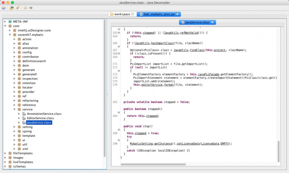 ~/Library/Application/ Support/IntelliJIdea2016.2/mybatis_plus/lib 。主要的代码位于mybatis_plus.jar中。 修改stop方法,原来的方法: