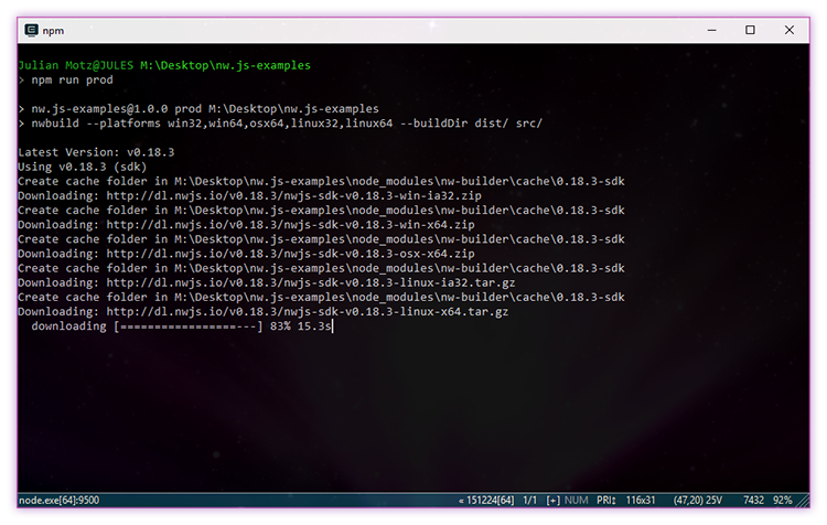 要进行生产构建需要使用 nw-builder ,它支持针对 Windows、Linux 和 macOS 进行输出。在我们的例子中,我们会针对所有这些平台打包,并且包含32位和64位版本。对于 macOS 来说,目前只能在以前的模式下构建 32位的版本。(参阅 GitHub 上的 这个 issue 。)所以,我们只构建64位版本。