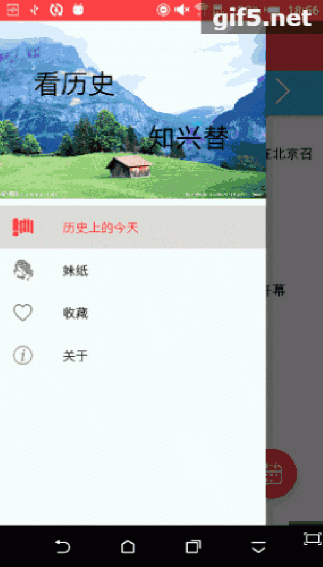 <?xml version="1.0" encoding="utf-8"?><menu xmlns:android="http://schemas.android.com/apk/res/android"> <item android:id="@+id/drawer_todayInHistory" android:checkable="true" android:icon="@drawable/ic_history" android:title="历史上的今天" /> <item android:id="@+id/drawer_gril" android:checkable="true" android:icon="@drawable/icon_gril" android:title="妹纸" /> <item android:id="@+id/drawer_like" android:checkable="true" android:icon="@drawable/ic_unlike" android:title="收藏" /> <item android:id="@+id/drawer_about" android:checkable="true" android:icon="@drawable/ic_about" android:title="关于" /></menu>