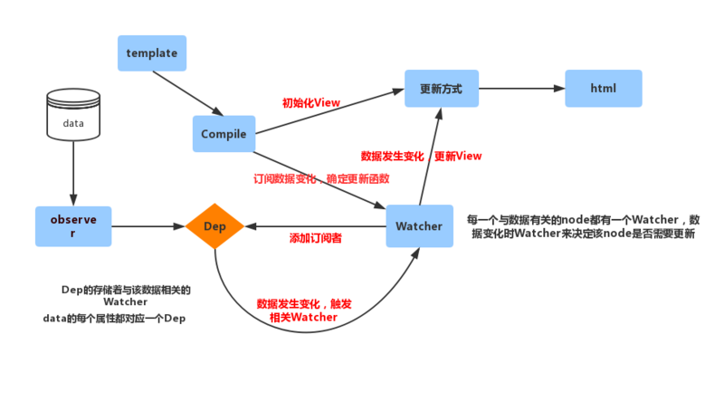 在 dirCollections 中还会做的就是将数据与View的 dom 节点相关联,利用的就是 Dep 与 Watcher ,页面上每一个与数据相关联的节点都含有一个 Watcher ,当数据发生变化是 Watcher 用于计算,是否需要更新该节点;数据的每一个属性都有一个 Dep ,当该属性发生变化时, Dep 会通知与该数据相关联的 Watcher 来进行计算是否需要更新对应页面。 Dep代码 , Watcher代码 。
