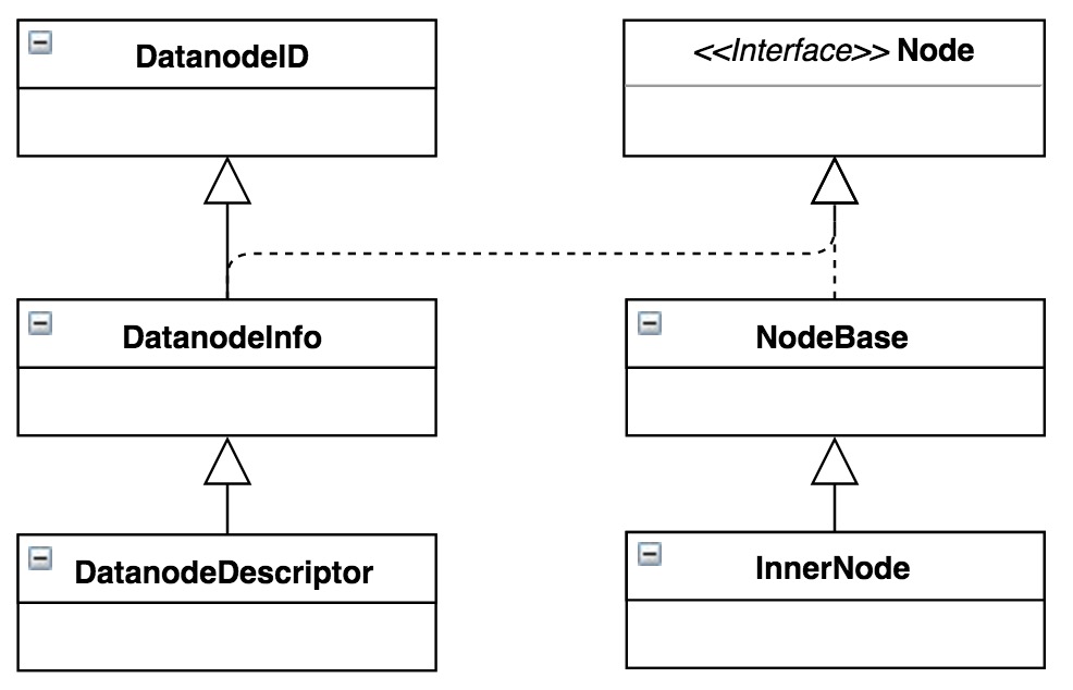 NameNode通过NetworkTopology维护整个集群的树状拓扑结构,当集群启动过程中,通过机架感知(通常都是外部脚本计算)逐渐建立起整个集群的机架拓扑结构,一般在NameNode的生命周期内不会发生大变化。拓扑结构的叶子节点DatanodeDescriptor是标识DataNode的关键结构,该类继承关系如图1所示。