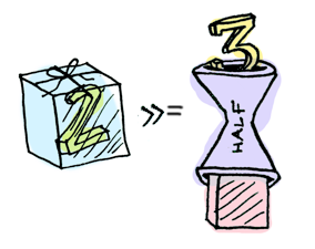 Prelude> [2, 4, 6] >>= (/x -> [x*x]) >>= (/x -> [x-1])