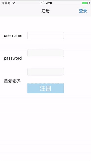 Demo地址是 这里 咱们这个Demo选用了最万能的登录注册功能,先来看下Demo的一些基本演示,并未包含所有细节,