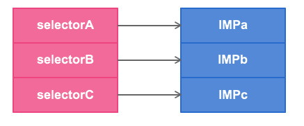 在 Objective-C 中,类的方法列表会把选择器的名称映射到方法的实现上,这样 动态消息转发系统 就可以以此找到需要调用的方法。这些方法是以函数指针的形式来表示,这种指针叫做 IMP 。