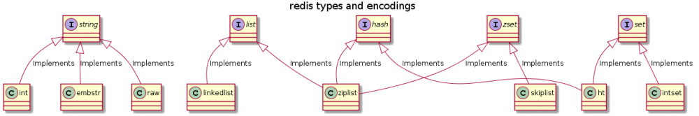 5种基本类型对应了int object.c , embstr object.c , raw sds.c , linkedlist adlist.c , ziplist ziplist.c , skiplist t_zset.c , ht dict.c , intset intset.c 这8种数据结构的实现。
