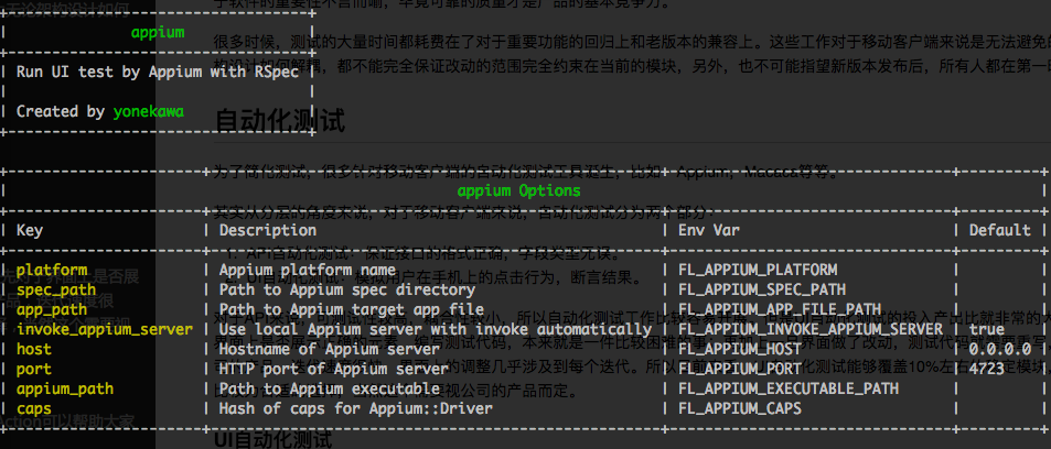 UI自动化测试有个比较著名的开源工具叫做 Appium ,同时支持iOS和Android平台,基于Server和Client模式,支持多种语言编写测试逻辑,应该是目前最为流行的测试工具之一。对于这个工具Fastlane有个对应的Action:Appium,这个Action可以帮助大家将Appium集成到Fastlane的自动化流程中,具体用法可以在命令行中查看,输入: