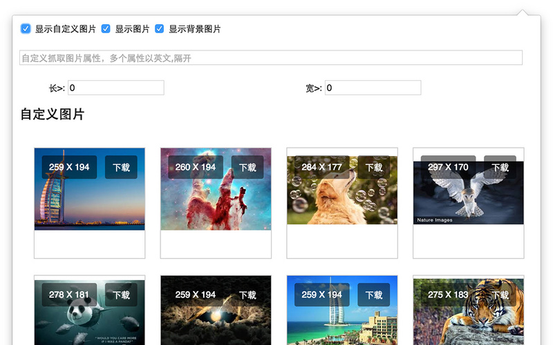 popup页用了chrome的tabs的api,query查询当前页签,并用sendMessage向页签发送action和配置的属性值,如果action为'all'则是收集所有图片,如果为'attr',则只收集所配置的属性图片, resetImgContainer 方法只是简单地将容器置空,response是content script所返回的结果,mapImg方法用来获取图片的长和宽,下文会讲到。