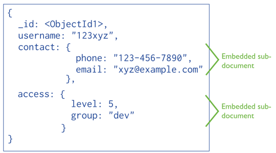 首先,MongoDB是文档型(Document store)的NoSQL数据库,数据以文档(对应关系型数据库的记录,本文有时候会混用)的形式在MongoDB中保存,文档实际上就是一个个JSON字符串,想必大家对JSON都比较熟悉,不赘述。使用JSON的好处是非常直观,通过一系列的Key-Value键值对来表示数据,符合我们的阅读习惯,下图所示是以JSON表示的用户信息文档。