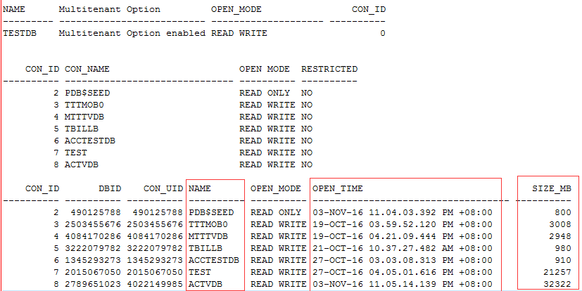 select con_id,dbid,con_uid,name,open_mode,open_time,trunc(total_size/1024/1024) size_MB from v/$pdbs;