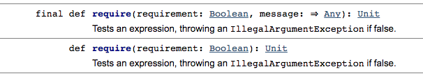 上面可以看出,由于这些方法是定义在 Predef 中的,而 Predef 对象的方法默认是被静态引入了的,所以无需写成 Predef.require() 这样子。