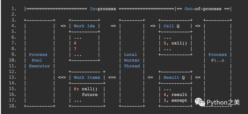 从「Work Ids」队列中获取Work Id, 通过「Work Items」找到对应的_WorkItem。如果这个Item被取消了,就从「Work Items」里面把它删掉,否则重新打包成一个_CallItem放入「Call Q」这个队列。executor的那些进程会从队列中取_CallItem执行,并把结果封装成_ResultItems放入「Result Q」队列中。