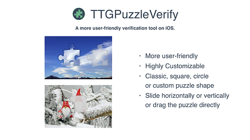 By completing image puzzle game , TTGPuzzleVerify is a more user-friendly verification tool on iOS, which is highly customizable and easy to use. It supports square, circle, classic or custom puzzle shape. User can complete the verification by sliding horizontally, vertically or directly dragging the puzzle block.