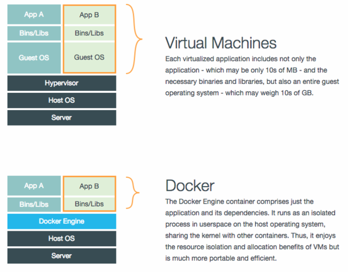 本系列文章将重点介绍如何在Docker中使用MongoDB,从单一的开发/测试环境设置到复杂的多主机MongoDB集群都会涉及,包括日志管理、性能、数据持久化等。下面是虚拟机和Docker的对比: