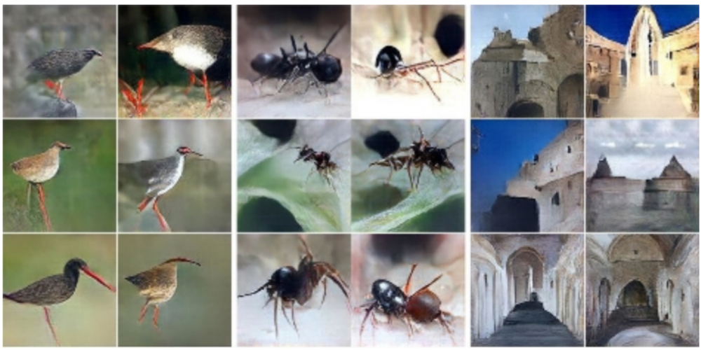 从 Plug & Play Generative Networks(Nguyen et al. 2016)上面的图像分别是赤足鹬鸟、蚂蚁和修道院,看上去比最近的其他几张生成图都要真实