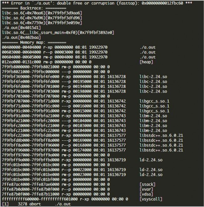 我的朋友在GDB方面比较有经验,就让他来带路。我的记忆有点模糊,但这大约发生了什么。我们观察到的第一件事情是错误出现在一个节点的析构函数中,接着在那里释放一些内存。遗憾的是,并没有查出为何会出现这样的情况。在反复的调试器中,我们得到了一个大突破。跳表的析构函数似乎被调用了不止一次。这就可以解释我们看到节点的析构函数出现奇怪的行为以及内存错误。在修改了代码输出一些调试信息后,我们证实了情况就是这样,但是那也很奇怪。我们没有显式调用析构函数,所以它唯一被(隐式)调用的地方是在程序末尾。