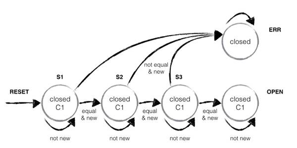 有限状态机(FSM),表示有限个状态以及在这些状态之间的转移和动作等行为的模型。一般通过状态、事件、转换和动作来描述有限状态机,下面是描述组合锁状态机的模型图,包括5个状态、5个状态自转换、6个状态间转换和1个复位 RESET 转换到状态 S1。状态机,能够记住目前所处的状态,根据当前的状态可以做出相应的决策,并且在进入不同的状态时,可以做不同的操作。通过状态机将复杂的关系简单化,利用这种自然而直观的方式可以让代码更容易理解。