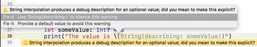 Swift 3.1 会在你往字符串里插入一个 Optional 值的时候 发出一个警告 , 因为这个行为可能会产生意料之外的结果. 这里有 Julio Carrettoni, Harlan Haskins 和 Robert Widmann 在 Swift-Evolution 的讨论 :