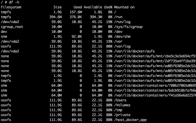 一开始就被Docker的官方文档误导了,以为‘Native’就真的是类似Linux支持哪样,直接使用了Mac的能力来做Docker。好在jason@uber指导了一下,豁然开朗。其实Mac Native还是有VM的,只是从用户体验上让你感觉不到而已,对此相对于Mesos,还是要为Docker的用户体验点个赞。就像你在Mac下找不到docker daemon一样。其实docker daemon还是真实存在。但是这个docker daemon配置已经被hardcode了,你没法更改。同时有个问题,在Mac下这个VM占用的空间会一直增大,无论你是否删除了docker image。这个文件存放在 /Users/macbook/Library/Containers/com.docker.docker/Data/com.docker.driver.amd64-linux/Docker.qcow2 。之前犯了个低级错误,将这个文件一下子扩大了10G,而我的Mac的硬盘又小,害我一直要删文件腾空间。
