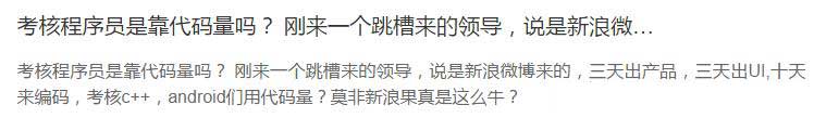 考 核员工的代码量,真不是明智的选择。但是就是有些公司,考核程序员是按照代码量。有网友爆料称,公司刚来了一个跳槽过来的领导。据说这位领导是新浪微博来 的,三天就出产品,三天就出UI,十天来编码。这位匿名网友称,考核c++,android却用代码量,难道新浪真的这么牛逼?
