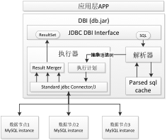 Driver模式的特点在于应用通过DDB提供的JDBC Driver来访问DDB,类似与通过MySQL的JDBC驱动访问MySQL。而对于MySQL的驱动connector/J,只需要实现将SQL按照特定协议编码和转码即可。而DDB的驱动为了实现透明的分库分表,需要做很多额外的工作,如下图所示: