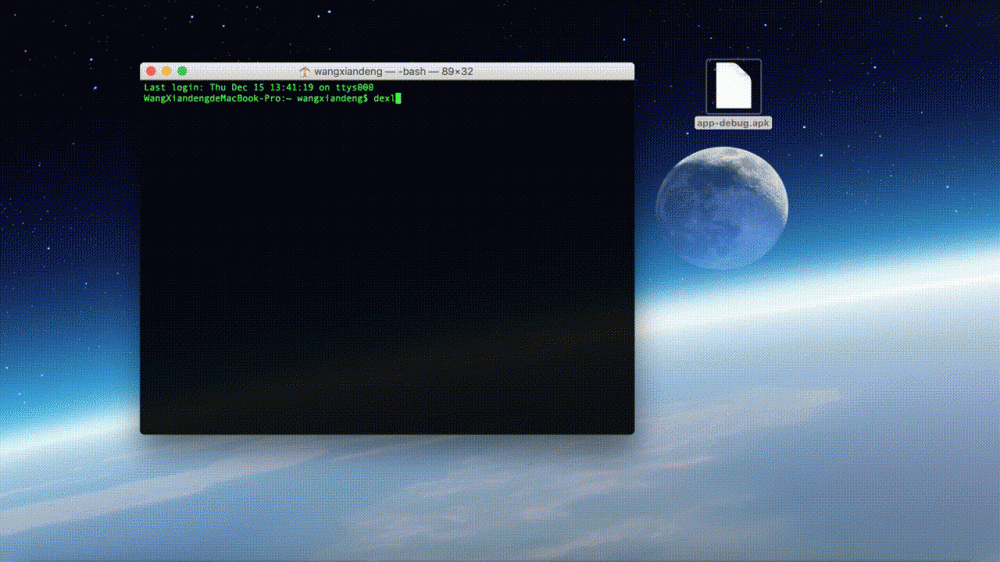 3.现在就可以使用了:在终端输入 dexlooker.py,拖入你的apk文件,将会自动为你反编译apk并打开JD-GUI查看jar文件