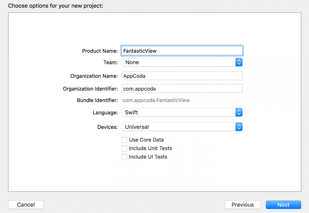 让我们先从最基础的地方开始。首先,在 Xcode 中创建一个新工程,选择使用 single view 模版。将工程命名为 FantasticView。项目创建之后,添加一个同名的 Swift 文件 FantasticView.swift 。