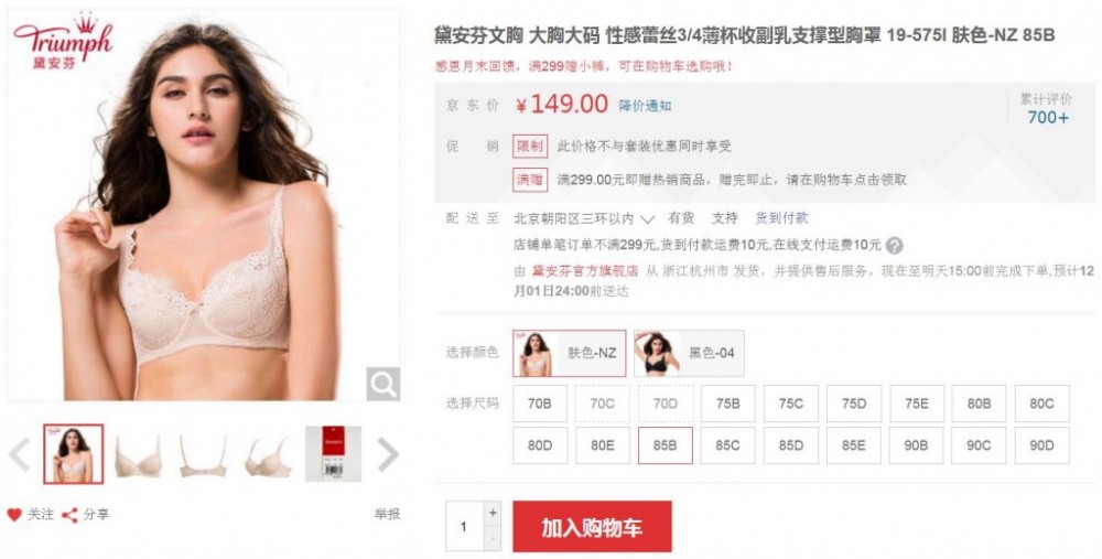 本篇文章是python爬虫系列的第三篇,介绍如何抓取京东商城商品评论信息,并对这些评论信息进行分析和可视化。下面是要抓取的商品信息,一款女士文胸。这个商品共有红色,黑色和肤色三种颜色, 70B到90D共18个尺寸,以及超过700条的购买评论。