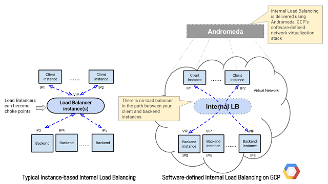 Similar to our HTTP(S) Load Balancer and Network Load Balancer, Internal Load Balancing is neither a hardware appliance nor an instance-based solution. It is software-defined load balancing delivered using Andromeda , Google’s network virtualization stack.