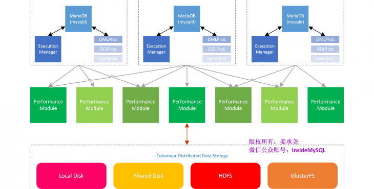 上图是根据文档整理的MariaDBColumn Store的架构图。与常见的大数据平台类似,分为计算层和存储层,同时也都是可扩展的。计算层需要由下面的几个主要进程构成: