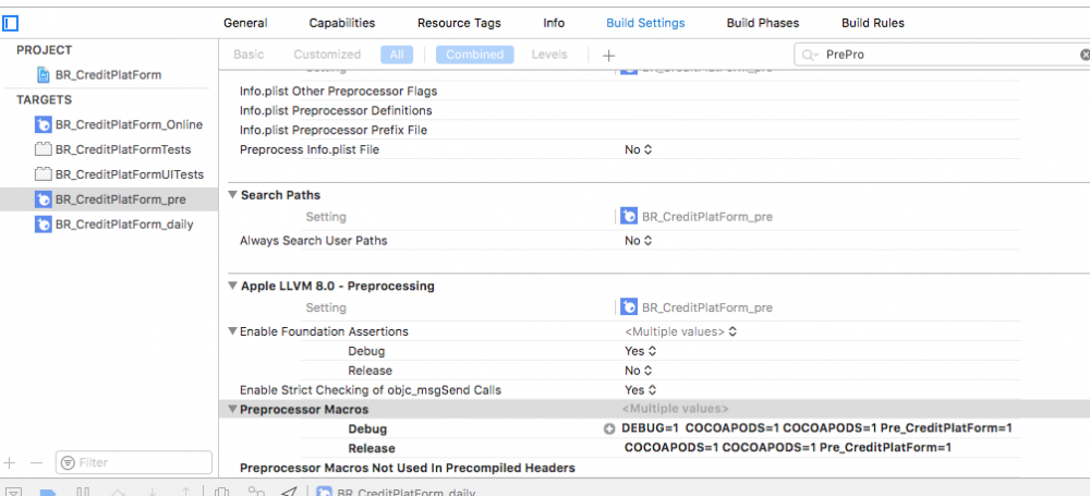 如果你现在有一个产品,你要做不同的环境出来,包括线上、预发、日常等等。这个时候你就可以来建立多个Target来实现。你先选中Targets里面的默认的第一个,然后右击弹出一个小列表:(Duplicate、Delete、Project Editor Help),顾名思义,Duplicate就是复制的意思,你可以选择一个Target进行复制,然后通过修改其General、Build Settings以及Build Phases来进行定制化修改,在Build Settings里面有一个Preprocessor Macros的选项,你可以直接设置定义宏的方式来对不同的Target进行区分,比如我的: