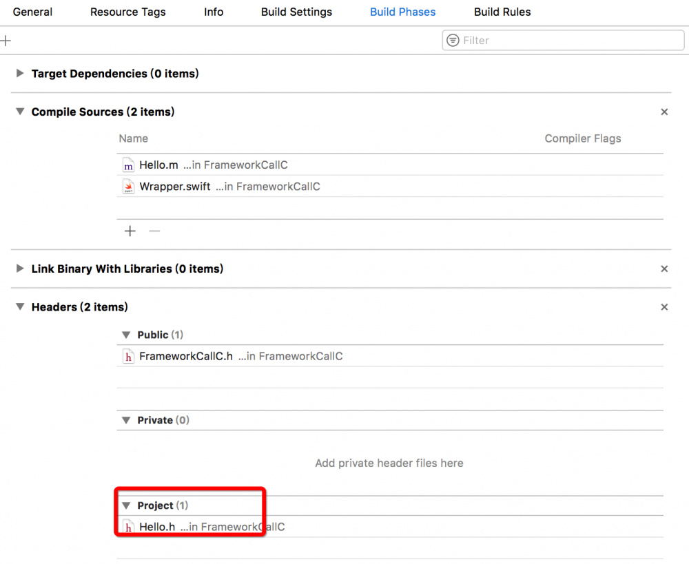此时到Build Phases->Headers,将Hello.h拖到Public,再编译通过,